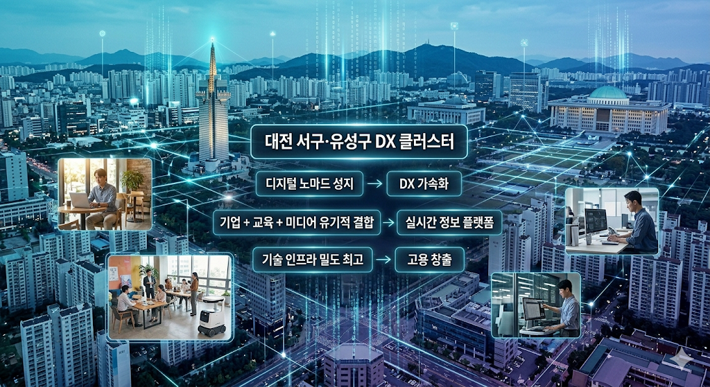 ■ 서구·유성구 중심의 ‘디지털 전환(DX)’ 가속화 대전 서구와 유성구를 잇는 스타트업 및 IT 클러스터의 확장세도 주목할 만하다. 공유 오피스와 디지털 협업 공간을 중심으로 1인 기업과 프리랜서들의 DX(디지털 전환) 지원 체계가 공고해지면서, 대전은 이제 수도권 못지않은 디지털 노마드의 성지로 떠오르고 있다.